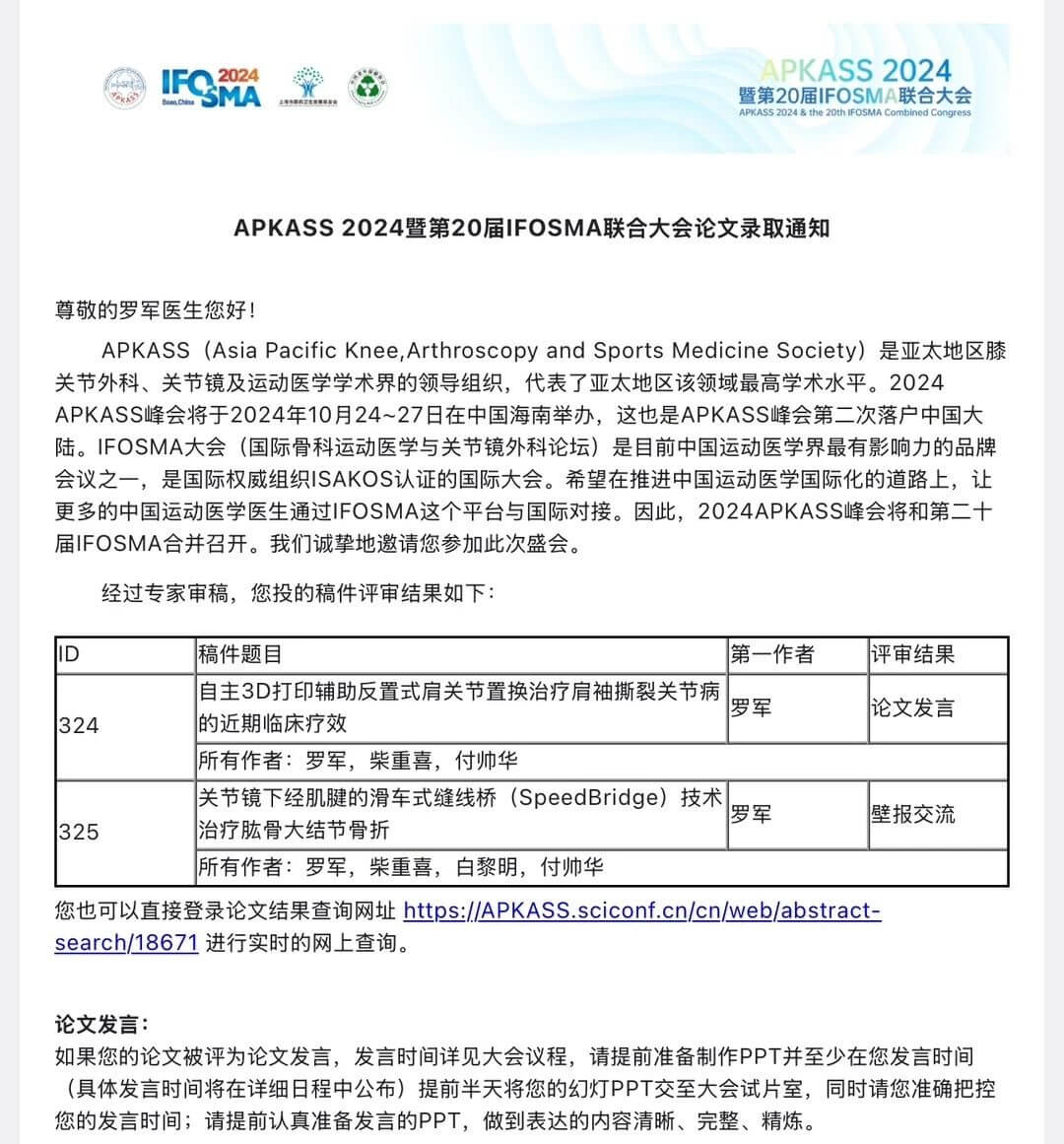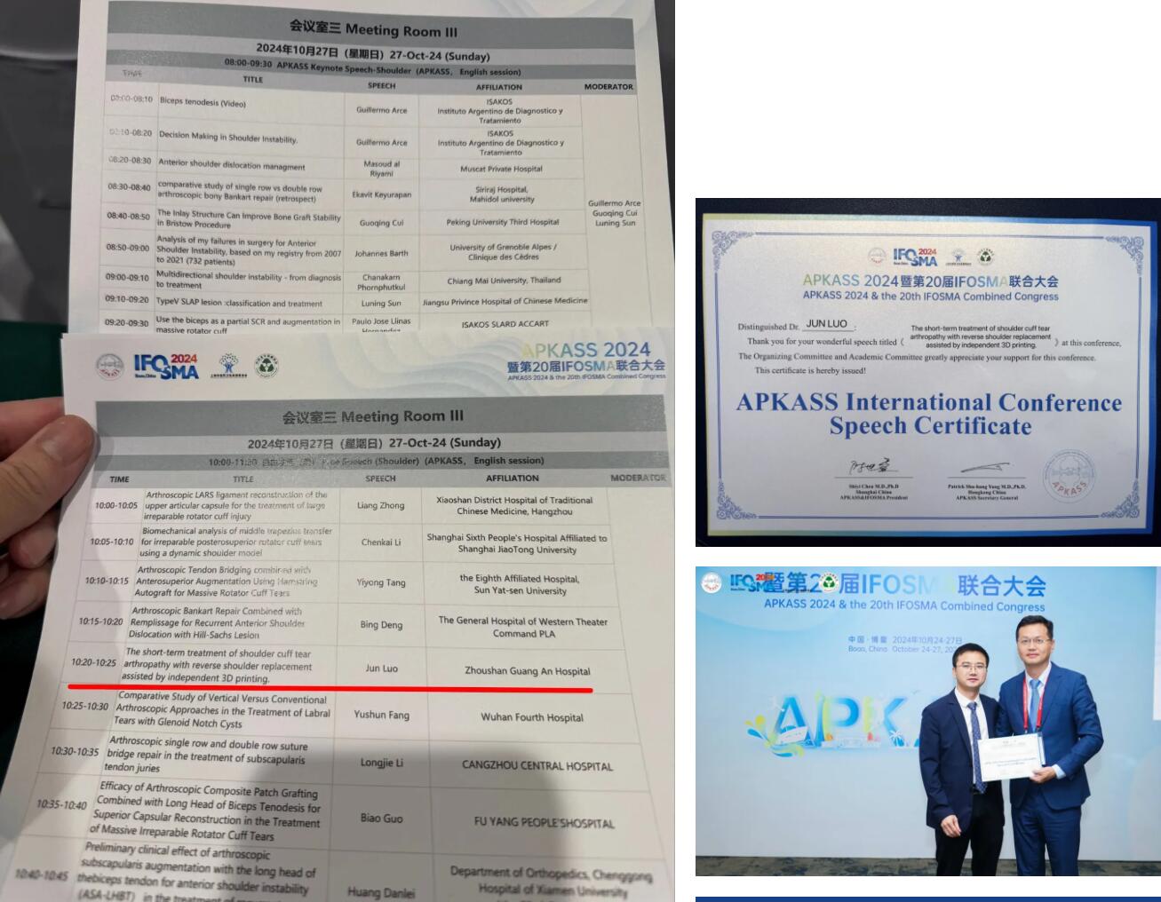 2024年10月24日—27日,亞太膝關(guān)節(jié)、關(guān)節(jié)鏡、運(yùn)動醫(yī)學(xué)會(APKASS)2024年會暨第20屆國際骨科運(yùn)動醫(yī)學(xué)與關(guān)節(jié)鏡外科論壇(IFOSMA)聯(lián)合大會在海南博鰲亞洲論壇舉行。我院副院長羅軍主任受邀參加大會并在會上做相應(yīng)發(fā)言。