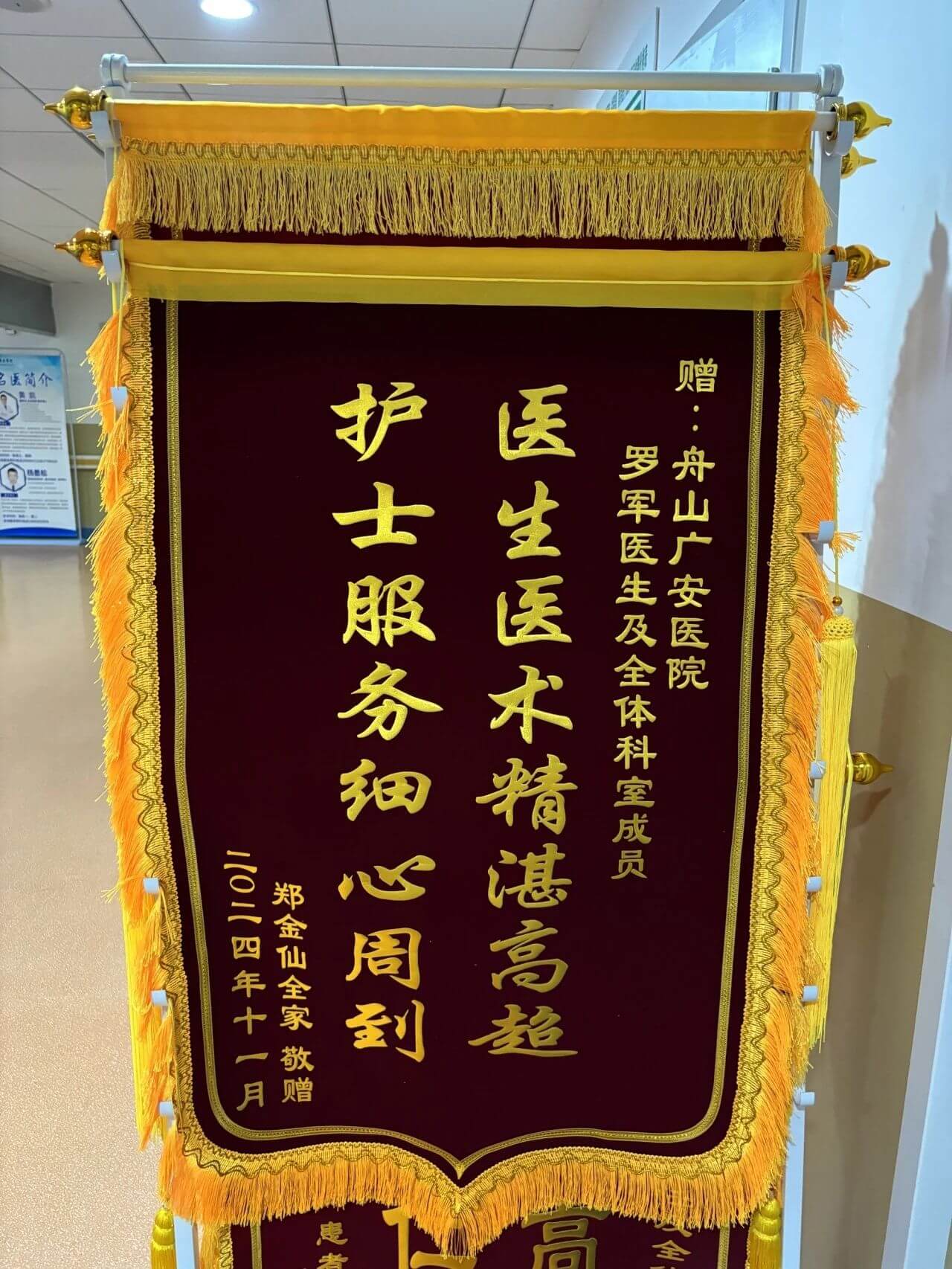 術(shù)后第一天鄭阿婆即可下地行走,看著鄭阿婆的滿臉笑容,這一刻,做為醫(yī)務(wù)人員的我們滿身的疲憊立馬煙消云散,做為兒女,看著自己84歲的老母親的對(duì)生活又重新燃起了新希望,心中感激之情油然而生,隨后便定制了錦旗向羅院長(zhǎng)表達(dá)了深刻的感謝。