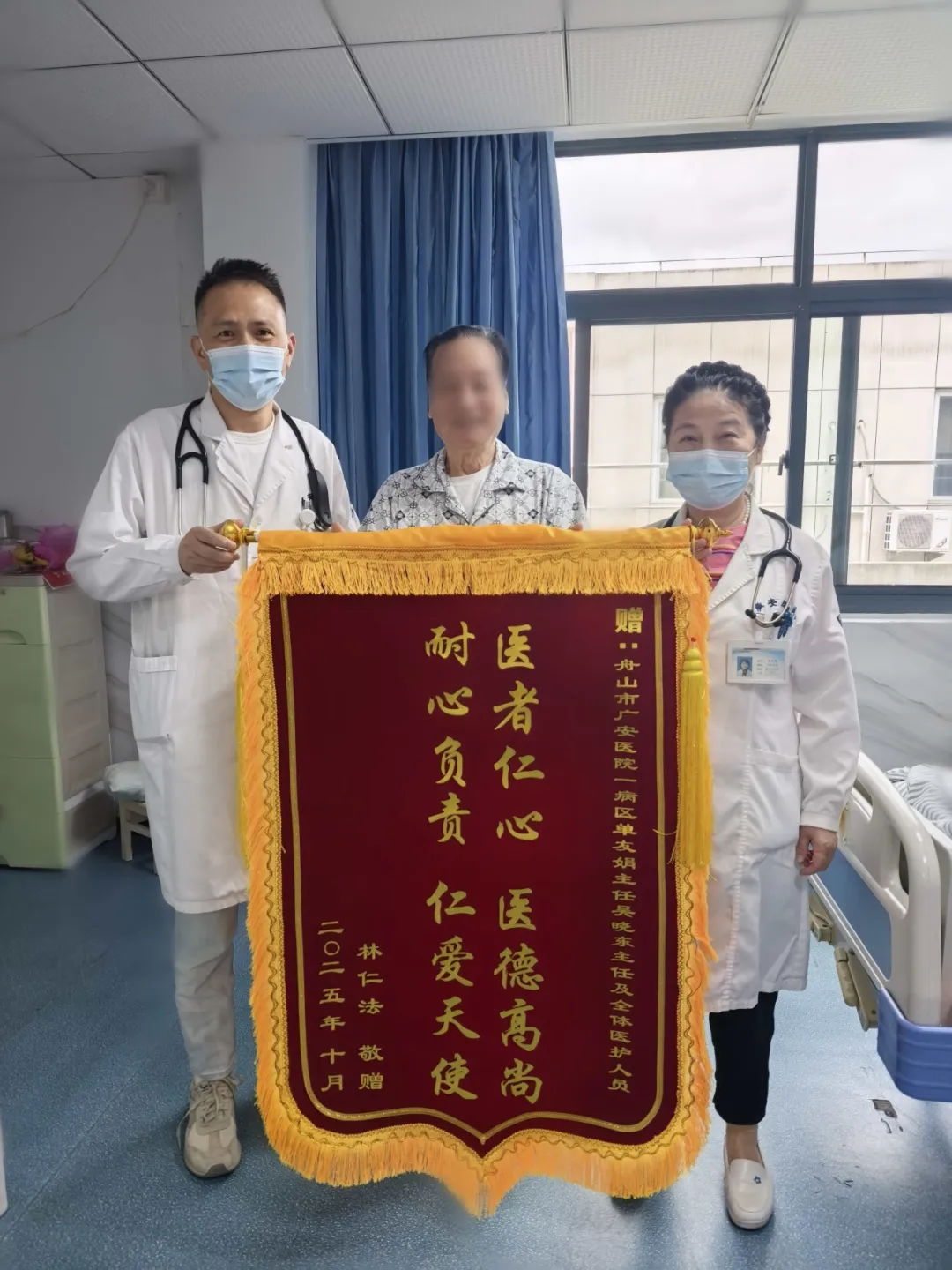 康復(fù)出院之際,激動萬分的患者做了一件他思量已久的事——他將一面精心準(zhǔn)備的錦旗,鄭重地送到了單主任和吳主任的手中。