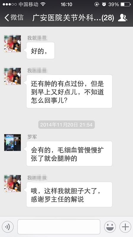 一個患者,在其疾病發(fā)生、發(fā)展、恢復期間,總歸遇見無數(shù)個問題,諸如:何時下地、何時拆除石膏,日常運動等,廣安醫(yī)院關節(jié)外科羅軍科主任,在結合現(xiàn)代科技,依托微信平臺,提高醫(yī)患溝通為主旨,建立了“廣安醫(yī)院關節(jié)外科朋友群”,以此,為了讓更多關節(jié)疾病患者,能得到更好、更專業(yè)的咨詢,避免患者因私自對患肢的處理,導致疾病沒有得到良好的恢復的風險