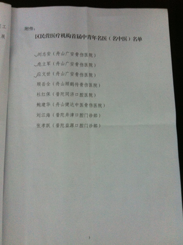 近日普陀區(qū)衛(wèi)生局民營(yíng)醫(yī)療機(jī)構(gòu)首屆名醫(yī)(名中醫(yī))評(píng)選活動(dòng)圓滿結(jié)束。我院劉志安、危立軍、應(yīng)文世被評(píng)為區(qū)民營(yíng)醫(yī)療機(jī)構(gòu)首屆中青年名醫(yī)(名中醫(yī))。