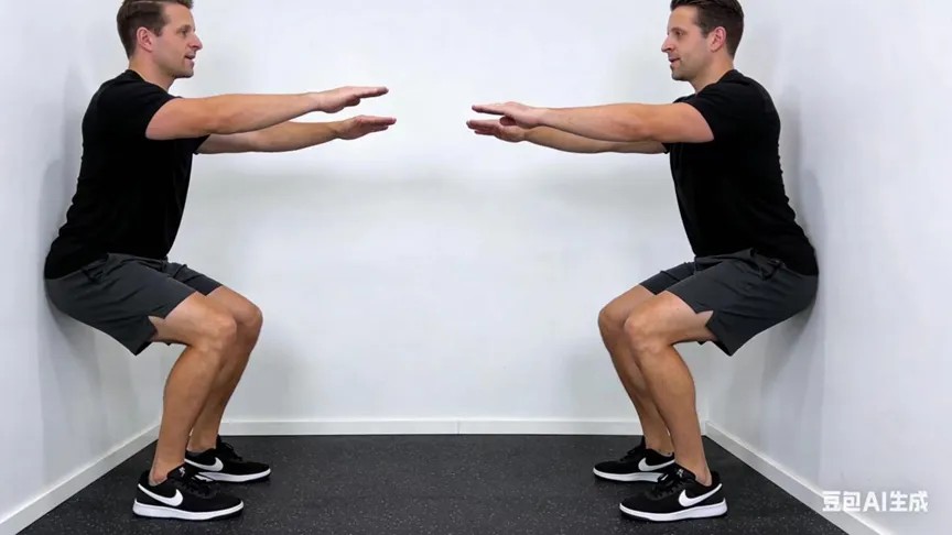 背部貼墻,雙腳與肩同寬, 緩慢下蹲至膝蓋微屈(不超過(guò)90度), 保持30秒,重復(fù)3次。