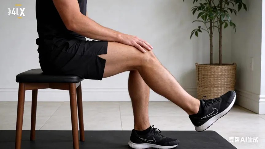 坐于椅子邊緣,背部挺直,緩慢伸直膝蓋,在最高點(diǎn)保持3秒,每組10-15次,每日2組。