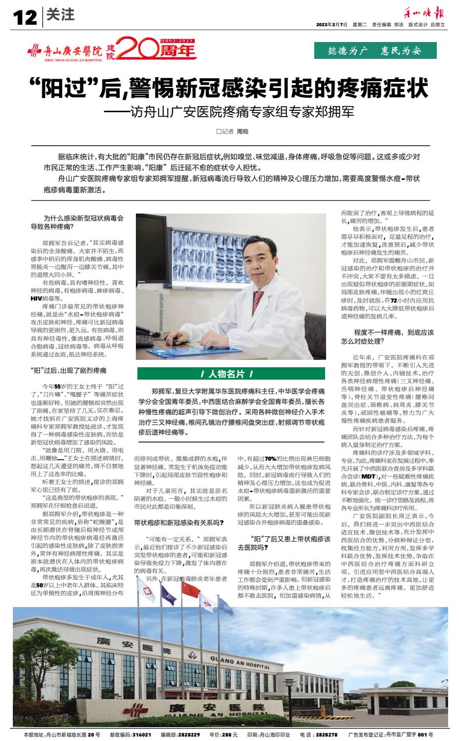 “陽(yáng)過”后,警惕新冠感染引起的疼痛癥狀——訪舟山廣安醫(yī)院疼痛專家組專家鄭擁軍